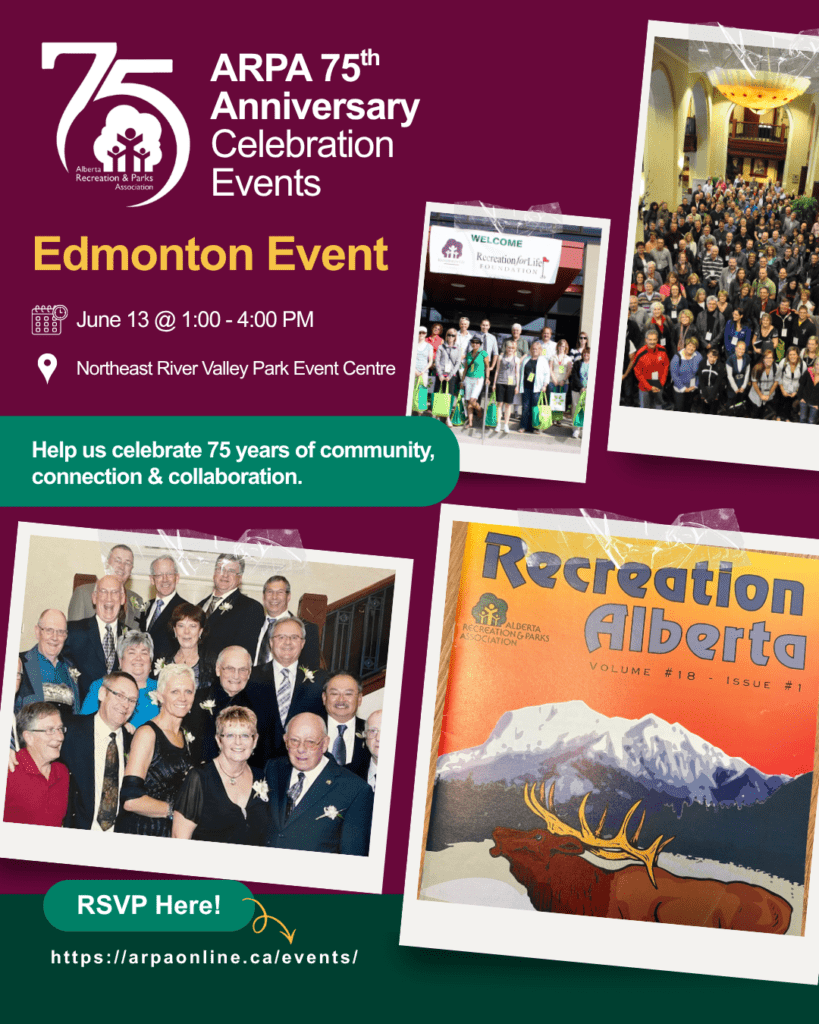 Come reminisce with old friends, and connect with new ones too! Celebrate the impact of recreation and parks, and look ahead to the future of healthy Alberta communities – eat some complimentary food, too!
