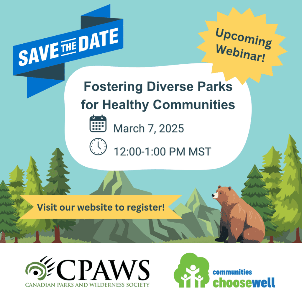 Communities ChooseWell is excited to welcome our friends at Canadian Parks and Wilderness Society for a free webinar on March 7, 2025 at 12:00PM – 1:00PM MST on Fostering Diverse Parks for Healthy Communities!